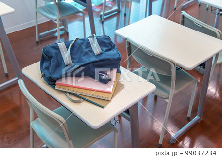 教室の机の上に置かれたスクールバックからはみ出したノートとペンケース。学校生活のイメージ、背景素材