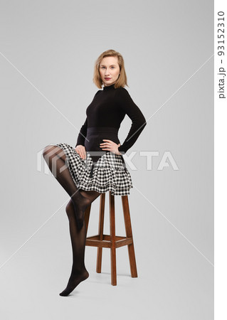 Barefoot woman in turtleneck and little skirt sitting on tall chair in studio over grey background