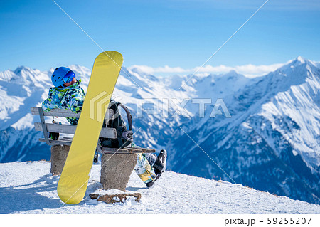 Image from back of athlete man sitting on bench next to snowboard in ski resort.