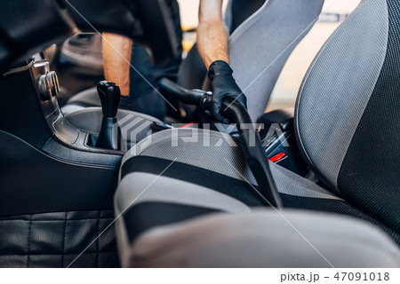Automotive cleaning process, Professional vehicle upholstery maintenance and dirt removal, Detailed view of cleaning device removing grime from dark fabric upholstery