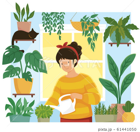 Woman enjoying her houseplants in cute cozy room, flat vector illustration.