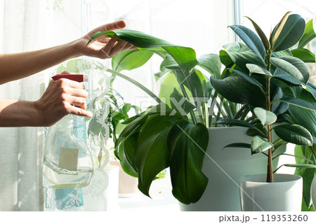 Sprayers and house plants on a window sill. home plant care. spraying with water. garden care. ficus. Home work. cleaning