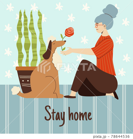 Stay home banner design with woman playing with dog, flat vector illustration.