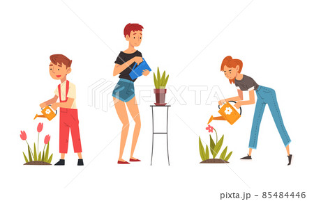 Woman and Boy Character Watering Plant Sprout Growing in Pot and Soil Vector Set