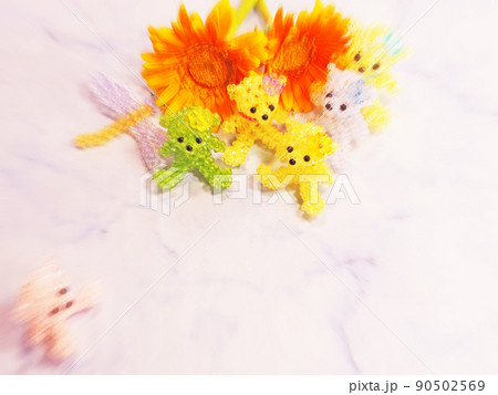 黄色いガーベラの花と手作りビーズ人形の仲間たち