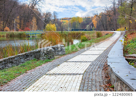 Walking along the tranquil lakeside path surrounded by autumn colors and gentle clouds