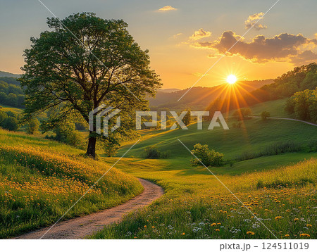 Scenic rural landscape with golden fields, blue sky with fluffy white clouds stretching to horizon, lush greenery of serene rural scene. Peaceful natural countryside view
