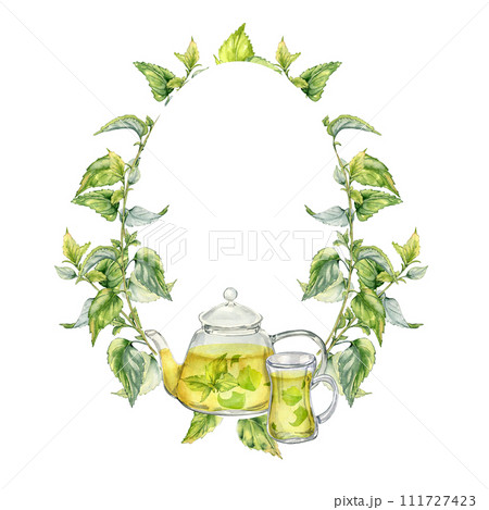 Frame of transparent teapot with herbs tea isolated on white . Glass teapot with nettle tea watercolor illustration. Herbs and cup of hot drink hand drawn. Packaging of dry herb, green tea