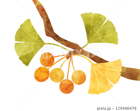 銀杏の木の枝になるギンナンと銀杏の葉の秋のイラスト 水彩風加工バージョン