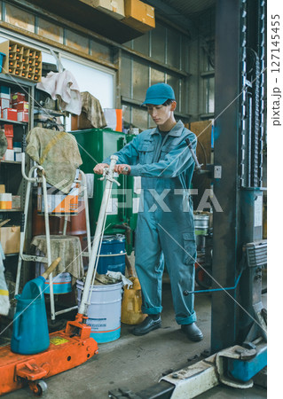 自動車整備工場でエンジンオイルのチェックをする自動車整備士