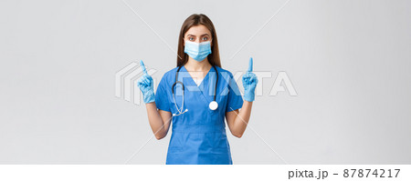 Covid-19, preventing virus, health, healthcare workers concept. Serious and confident female nurse in blue scrubs, medical mask PPE, pointing fingers up, inform patients how prevent corona infection