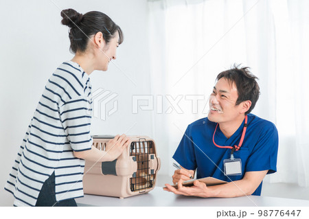 動物病院で獣医師に診察を受ける猫と飼い主のアジア人女性(ペット)
