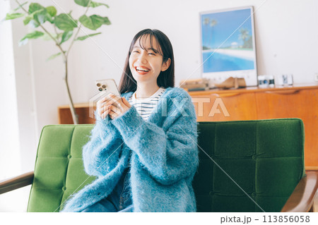 窓際でスマホを見ながら嬉しそうに微笑むミドル女性