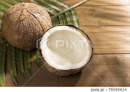 いろいろなココナッツ加工品と半分に割ったココナッツ