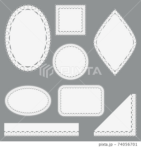 Blue lace doily napkin set. Three round frames with scalloped, floral cutout borders. Paper coaster patterns with varied edge designs. Vintage card, invitation, table decoration, tea party. Vector.