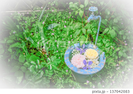 アンティーク風の青いバケツと蛇口のフラワーディスプレイ