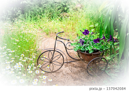アンティークな雰囲気の自転車型のフラワースタンドある庭