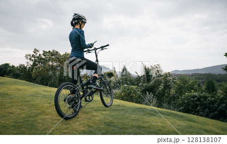 Woman cyclist using a smartphone on tropical mountain peak