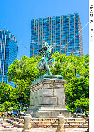 東京皇居外苑の楠木正成公騎馬銅像。斜め正面の角度。斜順光。背景は青空と丸の内地区のビルの一部。