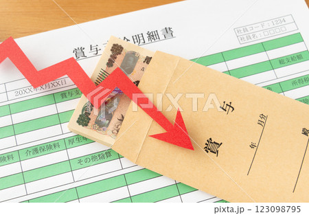 賞与支給明細書と賞与袋と下降矢印 賞与 ボーナス 支給明細書 賞与袋