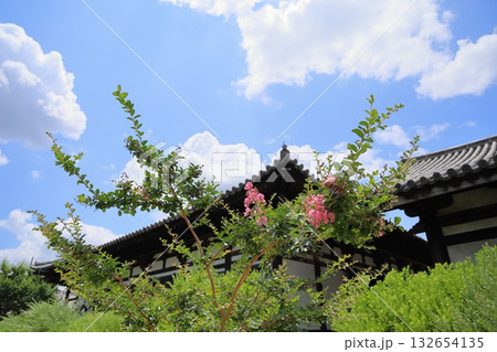 百日紅の花 背景 堂宇 夏空