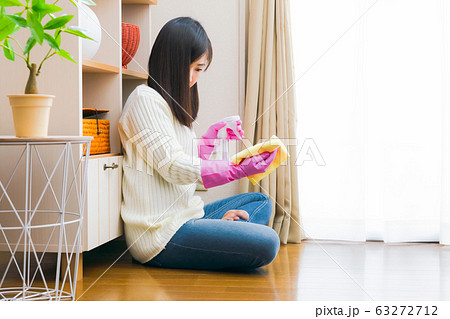 クロスにスプレーを吹きかける マイクロファイバー ゴム手袋 コピースペース