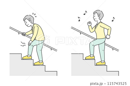 元気に階段を上る高齢女性と辛そうな高齢女性のイラスト