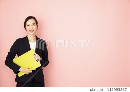 ピンクバックと笑顔でファイルを持つビジネスウーマン