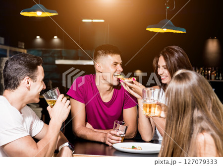 Cheerful friends in the pub. Drinking beer, eating pizza, talking, having fun.