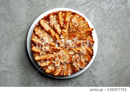 Freshly baked apple tart with almond slices on a white plate
