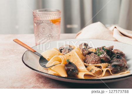 Delicious pappardelle pasta with mushrooms and cream served on a white plate