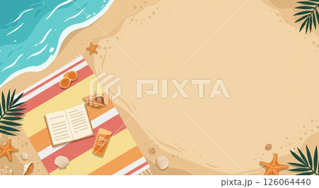 Top view beach essentials for perfect summer relax. Book, towel ready this summer