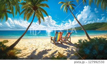 癒しの楽園へ誘う、AI生成の美しいビーチ。青い空とターコイズの海、白い砂浜が広がるリゾート地。