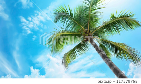 A tall palm tree with green fronds reaching toward a bright blue sky on a sunny day with scattered clouds..