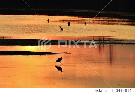朝焼けの色に染まる湖面と水鳥