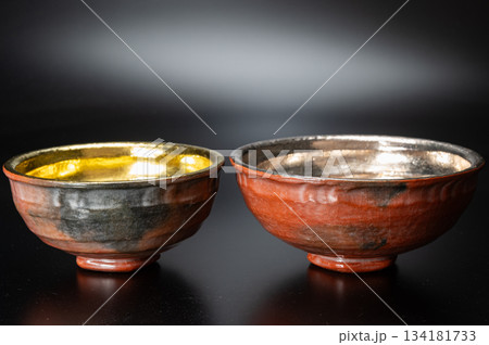 赤楽嶋台茶碗 金銀一双1|川崎和楽 作・華やかな楽焼の対茶碗