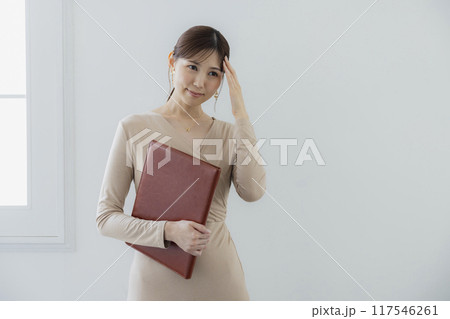 白い背景の前で正面を向く笑顔の若いエプロンを付けた女性
