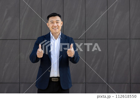 Smiling Asian businessman standing outdoors, giving two thumbs up with a modern building backdrop, conveying approval and success.