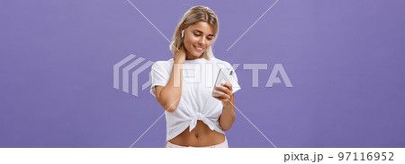 Woman receiving warm romantic message being delighted and touched feeling love gazing at smartphone screen wearing wireless earphones touching neck gently being sensitive and feminine
