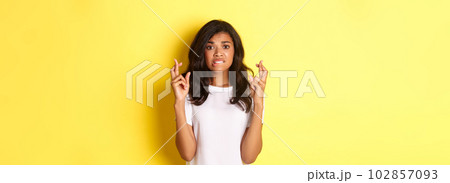 Image of anxious and hopeful african-american woman, waiting for news with fingers crossed, making wish, standing over yellow background