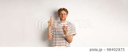 Holidays and celebration concept. Cheerful redhead man in glasses holding birthday cake with candle, cross fingers for good luck and making wish, white background