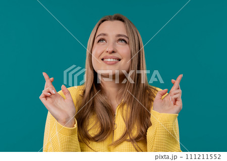 Young woman praying with crossed fingers on blue background. Lady begs someone