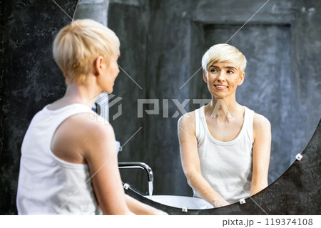 Beauty, health, cosmetics, anti-aging therapy and skin care concept - young beautiful brunette Caucasian woman posing and looking at the camera with a calm confident look like in a mirror