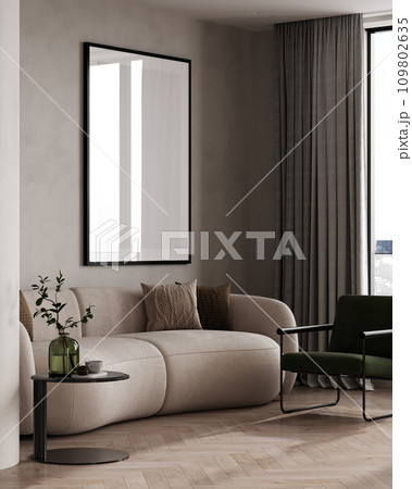 Poster frame mock-up in home interior background with modern sofa, table and decor in living room, 3d render