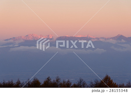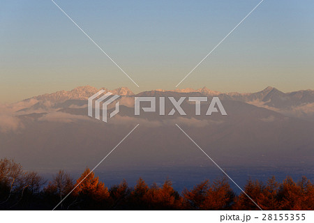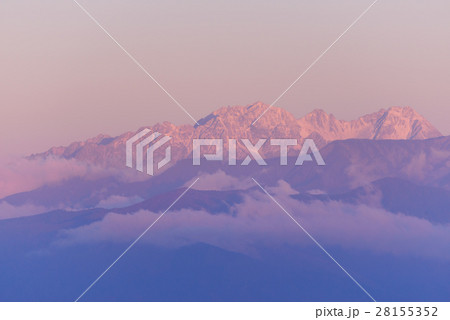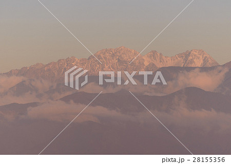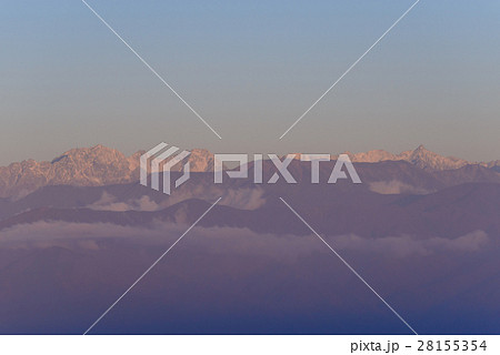 長野 朝日に照らされる北アルプス槍穂連峰
