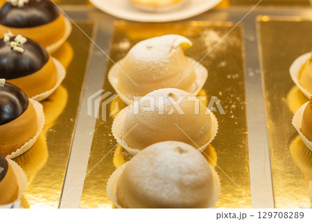 Assorted gourmet pastries displayed on a golden tray showcasing delightful textures and flavors