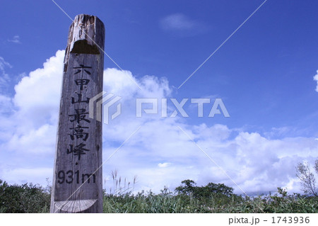 御坂山地の王岳山頂より望む夏の富士山 甲府名山 二等三角点(王岳)