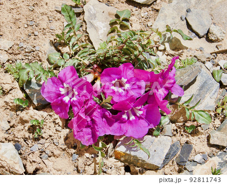 中国 青海省 黄河源流、ザリン湖畔に咲くノウゼンカズラ科ハナゴマ属 Incarvillea comp