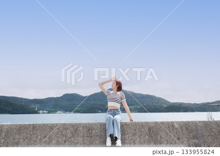 海を眺めてひと休みする20代女性。旅先で感じる風と光のエモーショナルな時間