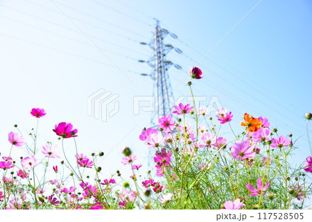 秋のイメージ コスモスと鉄塔